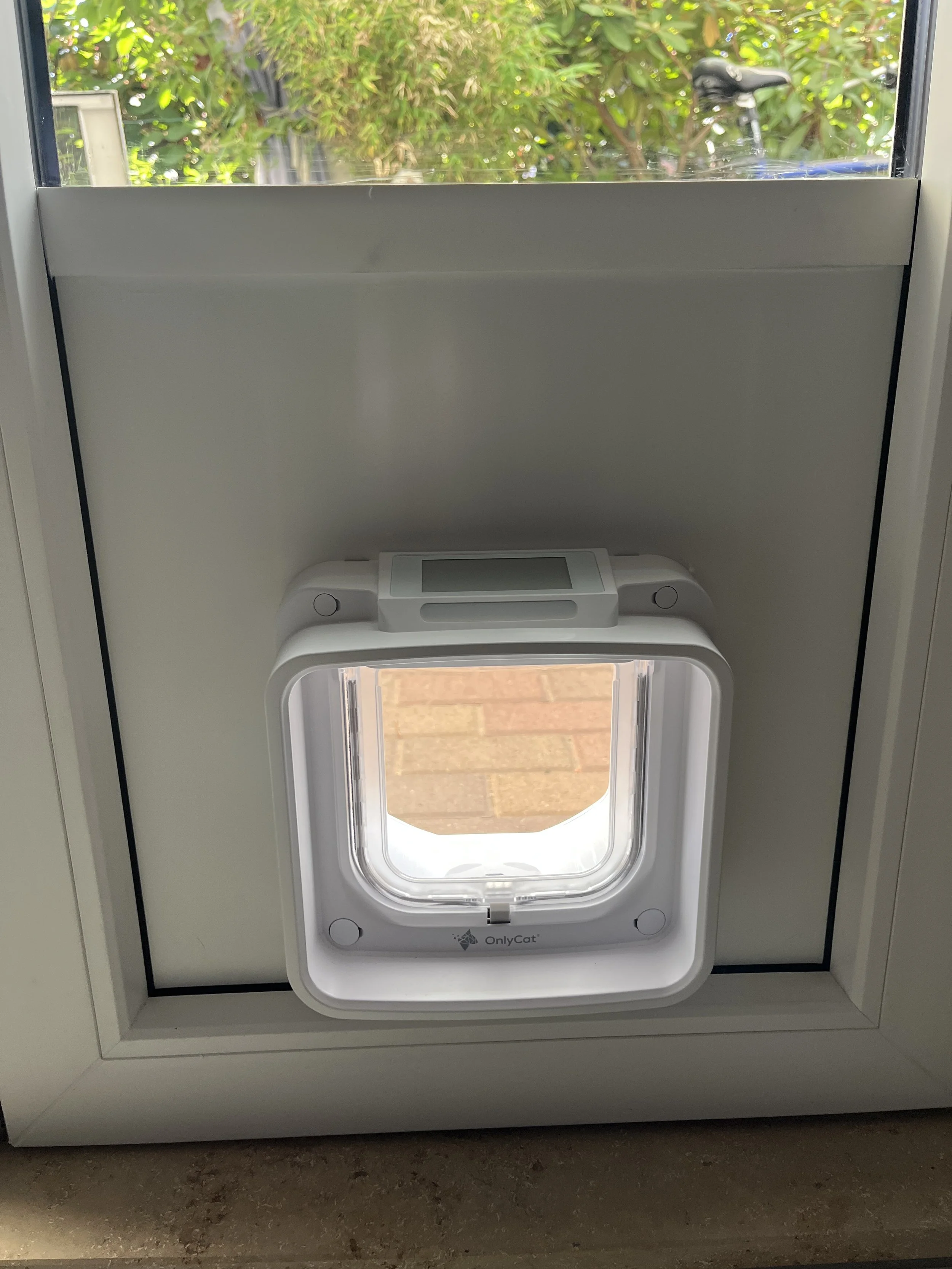 Katzenklappe in PVC Platte unter Glasscheibe